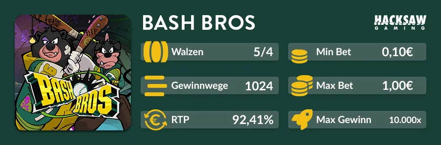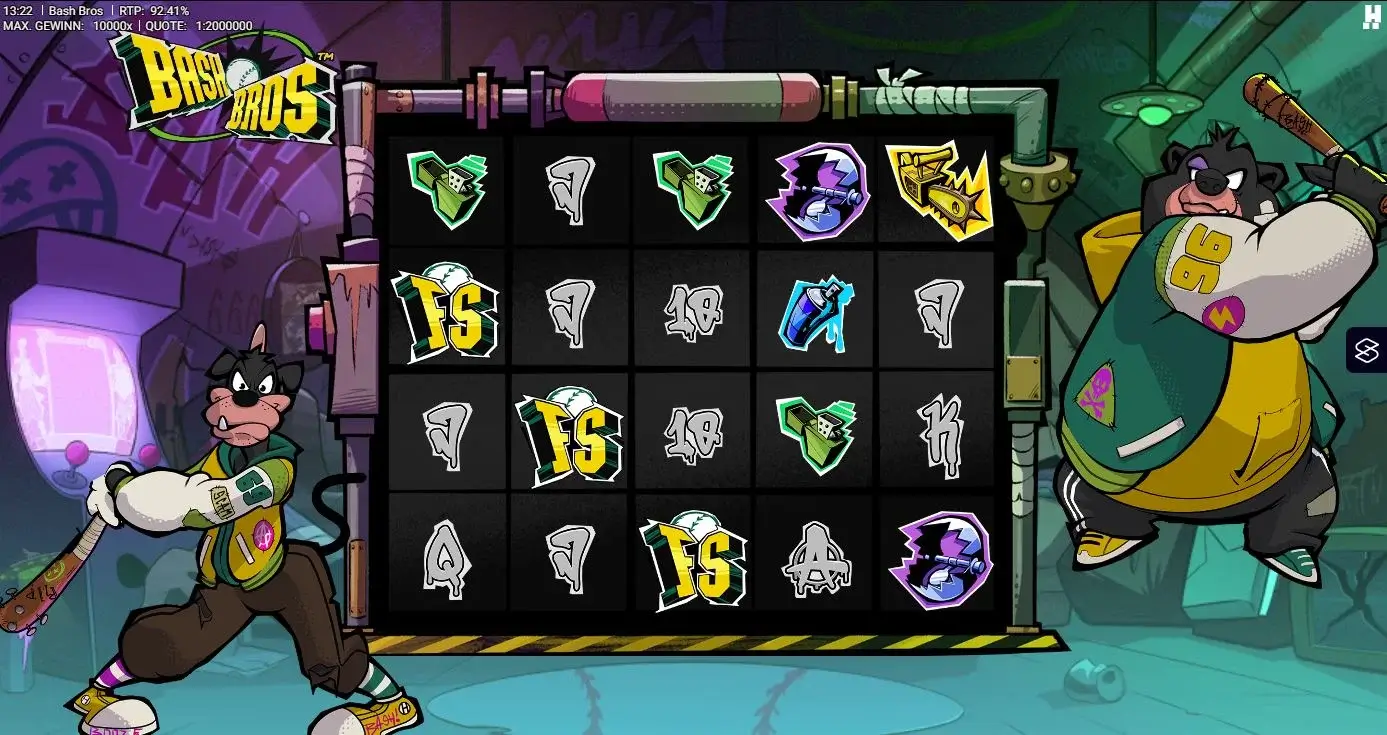 Der Slot Bash Bros von Hacksaw Gaming dreht sich um die beiden chaotischen Brüder Oskar und Fred, die ihre Baseballkarriere gegen ein Leben voller Zerstörung eingetauscht haben. In ihrem heruntergekommenen Bunker liefern sie sich ein anarchisches Spektakel auf den Walzen – inklusive Graffiti-Look, Baseballschlägern und jeder Menge Chaos. Statt klassischer Wild-Symbole setzt der Slot auf Geldsymbole und besondere Charakteraktionen, die das Spielgeschehen immer wieder durcheinanderwirbeln.