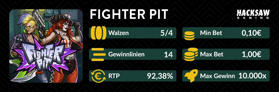 Der Online Slot Fighter Pit von Hacksaw Gaming bringt Sie mitten in einen chaotischen Untergrund-Fightclub. Zwei Teams – das rote und das grüne Team – treten gegeneinander an und versuchen, mit kraftvollen Faustsymbolen das Spielfeld zu dominieren. Optisch erinnert der Slot an ein klassisches Retro-Arcade-Spiel, komplett mit Metallrahmen, Steuerkreuz und Kämpferfiguren an den Seiten des Bildschirms. Gespielt wird auf 5 Walzen mit 4 Reihen und 14 Gewinnlinien.