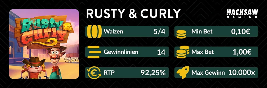 Mit seinem humorvollen Stil, ungewöhnlichen Charakteren und cleveren Features hebt sich Rusty & Curly deutlich von klassischen Western-Slots ab. Vor allem der mehrstufige Bonus kann richtig abgehen – oder komplett daneben gehen, ganz im typischen Hacksaw-Stil.